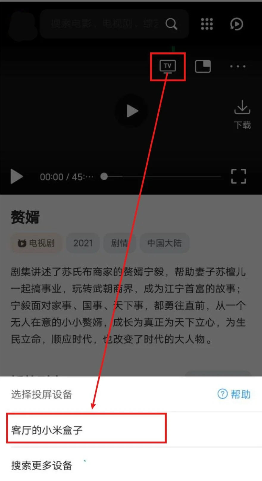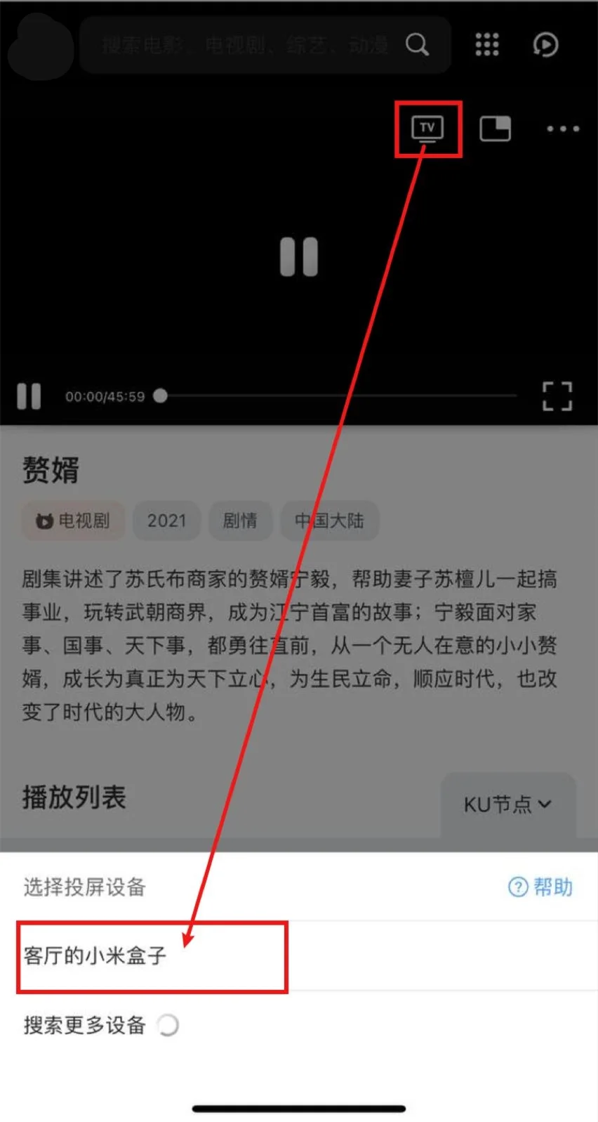 打开QQ浏览器(会接管网页播放器)->打开鼎诚28短剧->播放视频->选中投屏图标->等待搜寻出智能电视/电视盒子->选中,即可投屏。